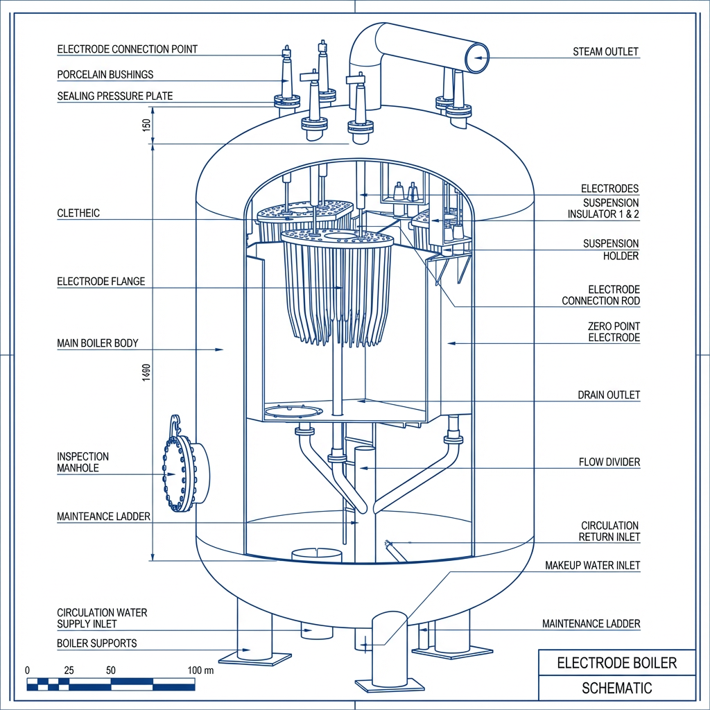 Den grundlæggende struktur i en elektrodedampkedel består af en ydre cylinder (trykbeholder) og en indre cylinder. Den ydre cylinder er jordet, mens den indre cylinder er isoleret med specialmateriale.