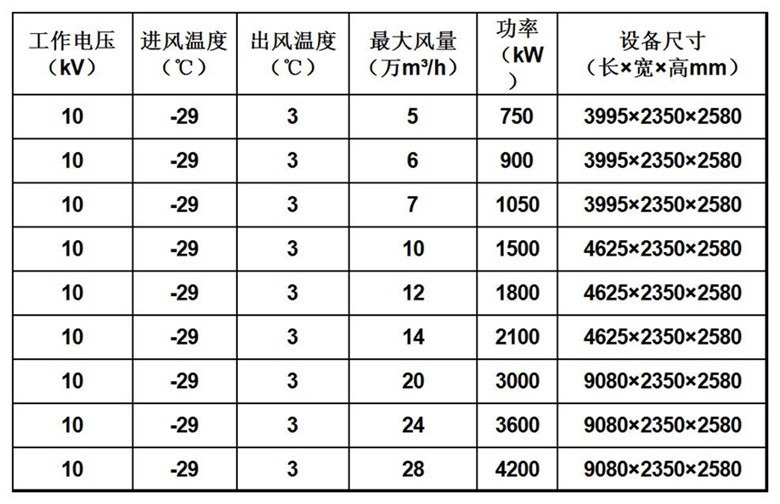 High-voltage and high-power air heater working principle: As shown in the schematic diagram, when high-voltage electricity is connected to the A-phase, B-phase and C-phase heating element groups, cold air enters through the inlet under the action of the fan. The cold air is heated to the set temperature when passing through these heating elements, and the heated air is emitted from the outlet, thereby completing the air heating process. Advantages and functions: The use of high-voltage electricity saves transformer costs; increases the power of a single unit; reduces the number of low-voltage units with equivalent power; eliminates the need for additional investment in transformers and related electrical cabinets; reduces investment; lowers the power consumption of the equipment and improves the safety of the equipment. Product application: High-voltage high-power air heaters are widely used. This air heater, commonly used for anti-freezing in mines and drying parts, has been widely used in aviation, weapons, chemical industry and many research and production laboratories in universities. High-voltage, high-power air heaters can heat any gas and produce dry, non-conductive, non-flammable, non-explosive, non-corrosive, pollution-free, safe and reliable air. The heated space experiences a rapid (controllable) temperature rise. Product Selection Table