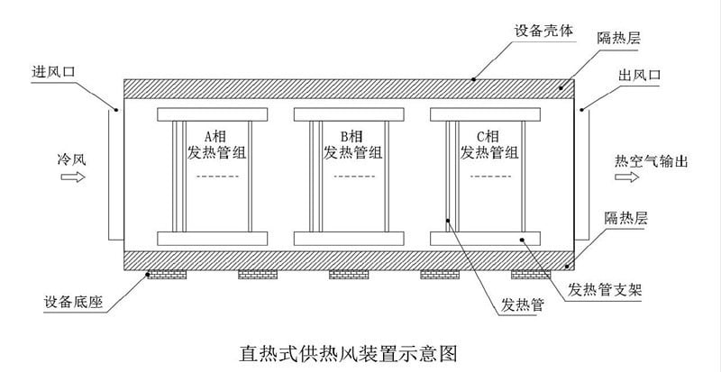 As shown in the schematic diagram, when high-voltage electricity is connected to the heat pipe groups of phase A, phase B and phase C, cold air enters through the air inlet under the action of the fan. After passing through the heat pipe groups of phase A, phase B and phase C, the cold air is heated to the set temperature. The heated air is then discharged from the air outlet, thereby completing the air heating process.